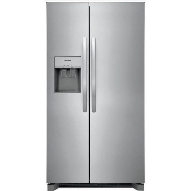 This Frigidaire side-by-side refrigerator features external water and ice dispensing system, LED lighting, clear crisper drawers and a total capacity of 22.2 cu.ft.